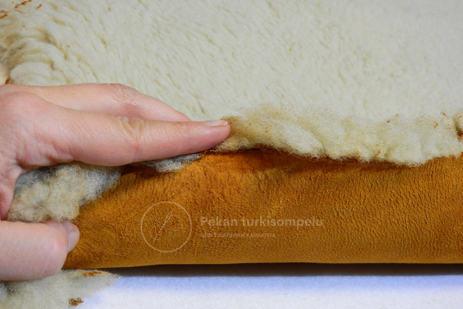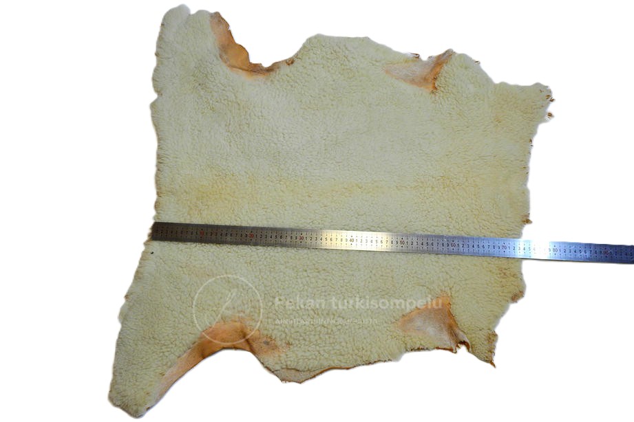 karva. Jonkun verran värjäytymiä villapuolella keski-selällä (ks. taljan kuva). Tupakanvärinen mokkanahka kääntöpuoli. 1 paketti, jossa 3 taljaa. Koko n. 73 x 55 cm. Yhteensä neljässä taljassa n. 13 nj.